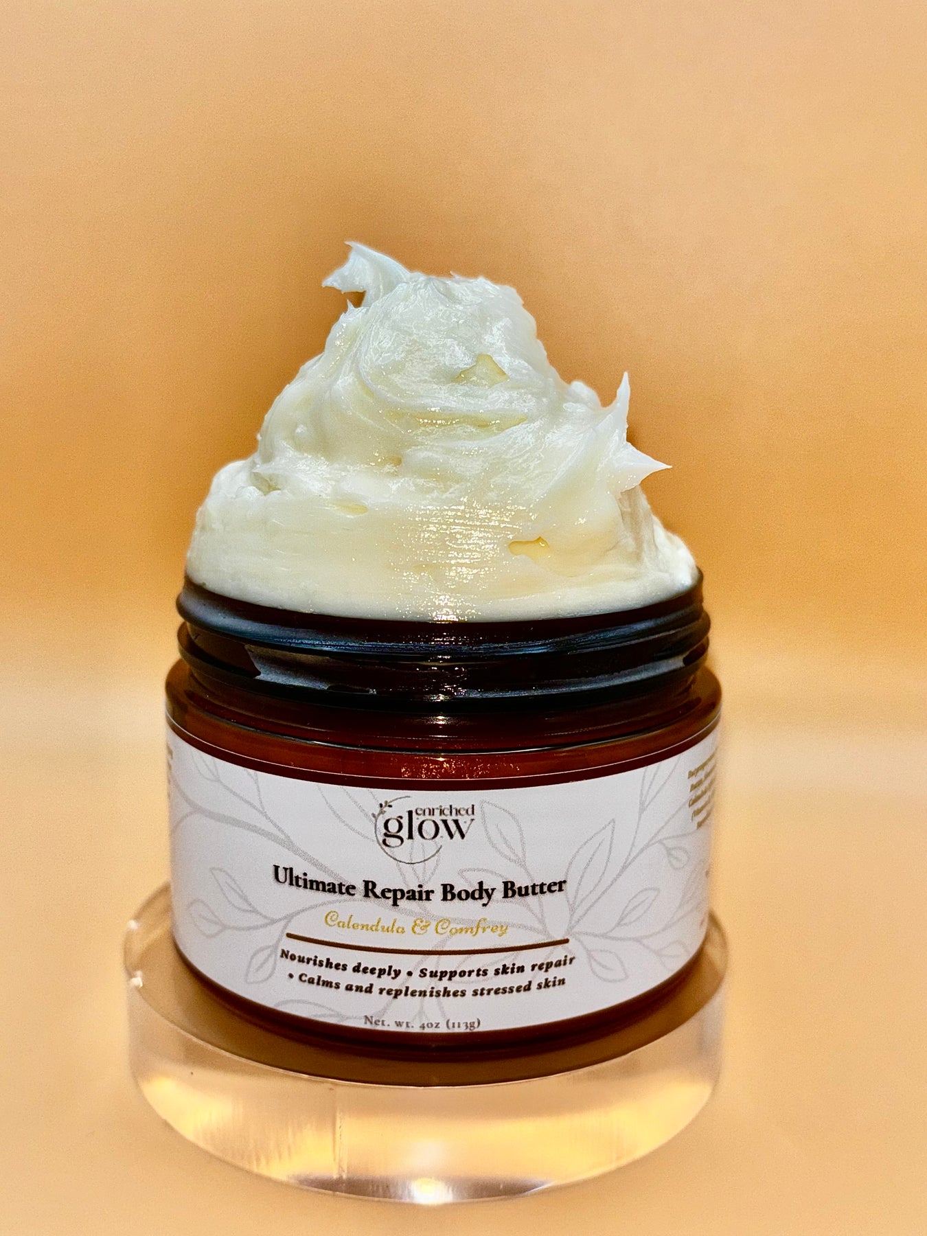 Soothe, repair, and deeply nourish your skin with our Ultimate Repair Body Butter a calming blend designed to restore balance and softness to even the most sensitive skin. Infused with calendula and comfrey–infused jojoba oil, this rich butter helps heal dry, irritated areas, reduce redness, and promote smooth, healthy skin.